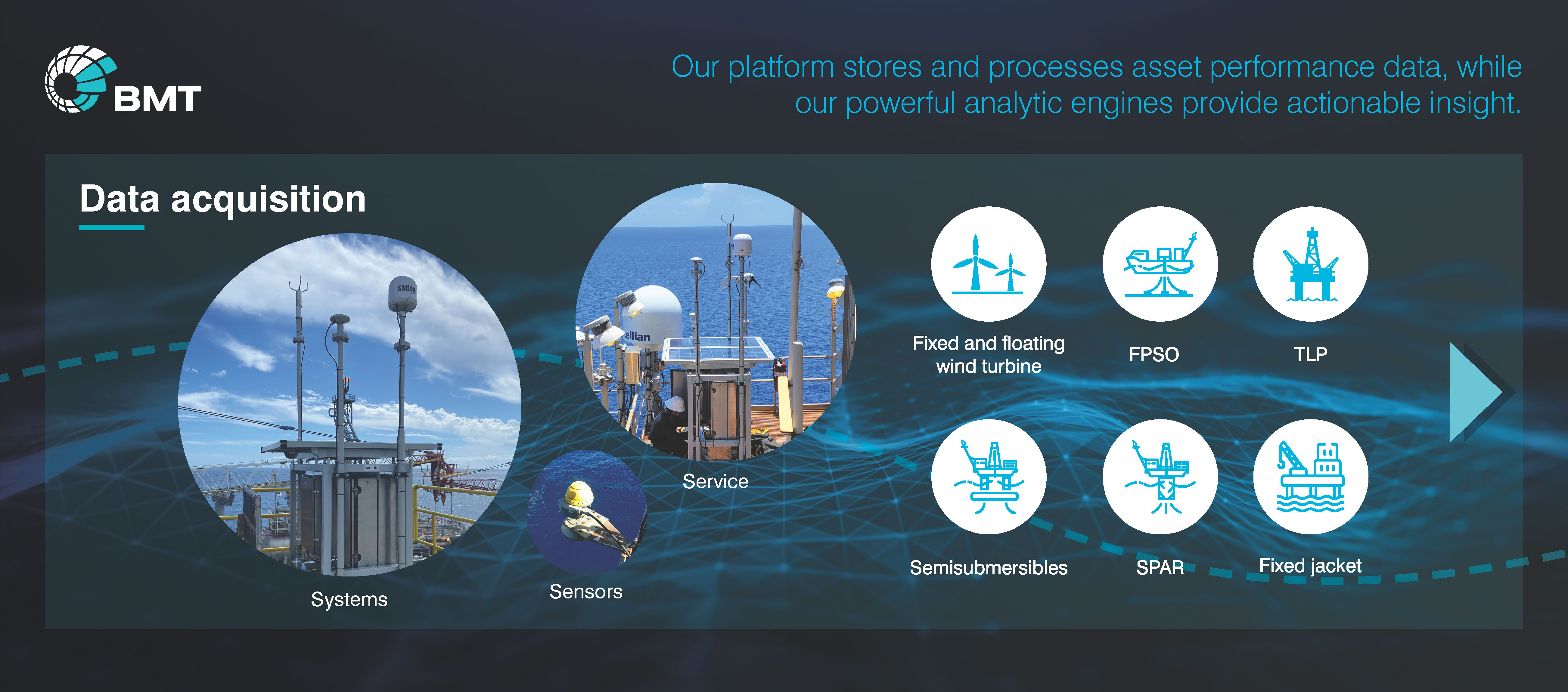 Our Integrated Marine Monitoring System is used on your FPSO to monitor the asset operating in a harsh offshore environment. The system provides a wide range of marine monitoring information, including the environmental conditions, the motions of the investment, and the structural response parameters required to ensure that the asset is operating within its design life.