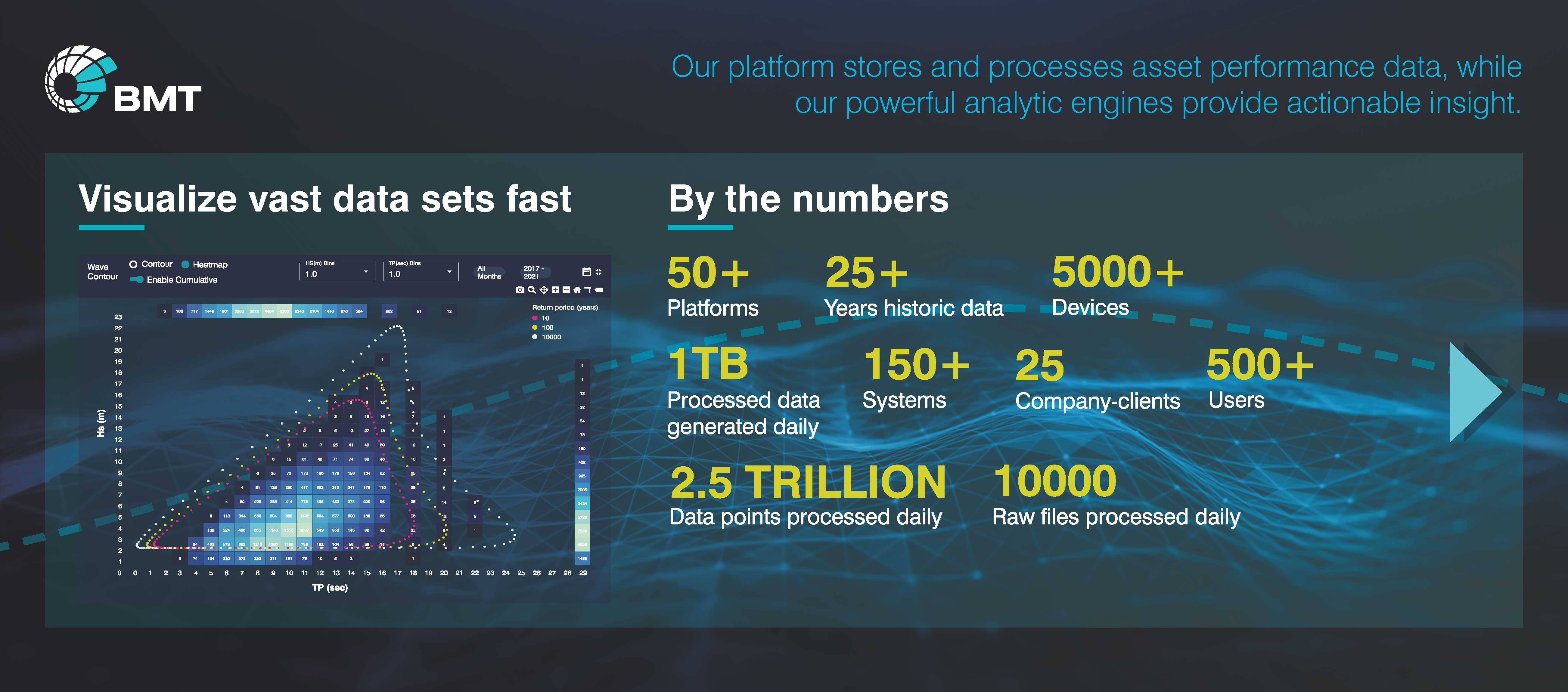 For over 20 years, we have been providing data QC and management of data collected from marine monitoring systems on the globally distributed assets of a significant oil operator. The time to cleanse data, often sampled at a high-frequency rate, resulting in terabytes of data and ultimately days of an analyst’s time, has been challenging. Working with various operators to overcome this challenge, we developed BMT DEEP, a data analytics platform suitable for secure, collaborative working on the operator’s data set.