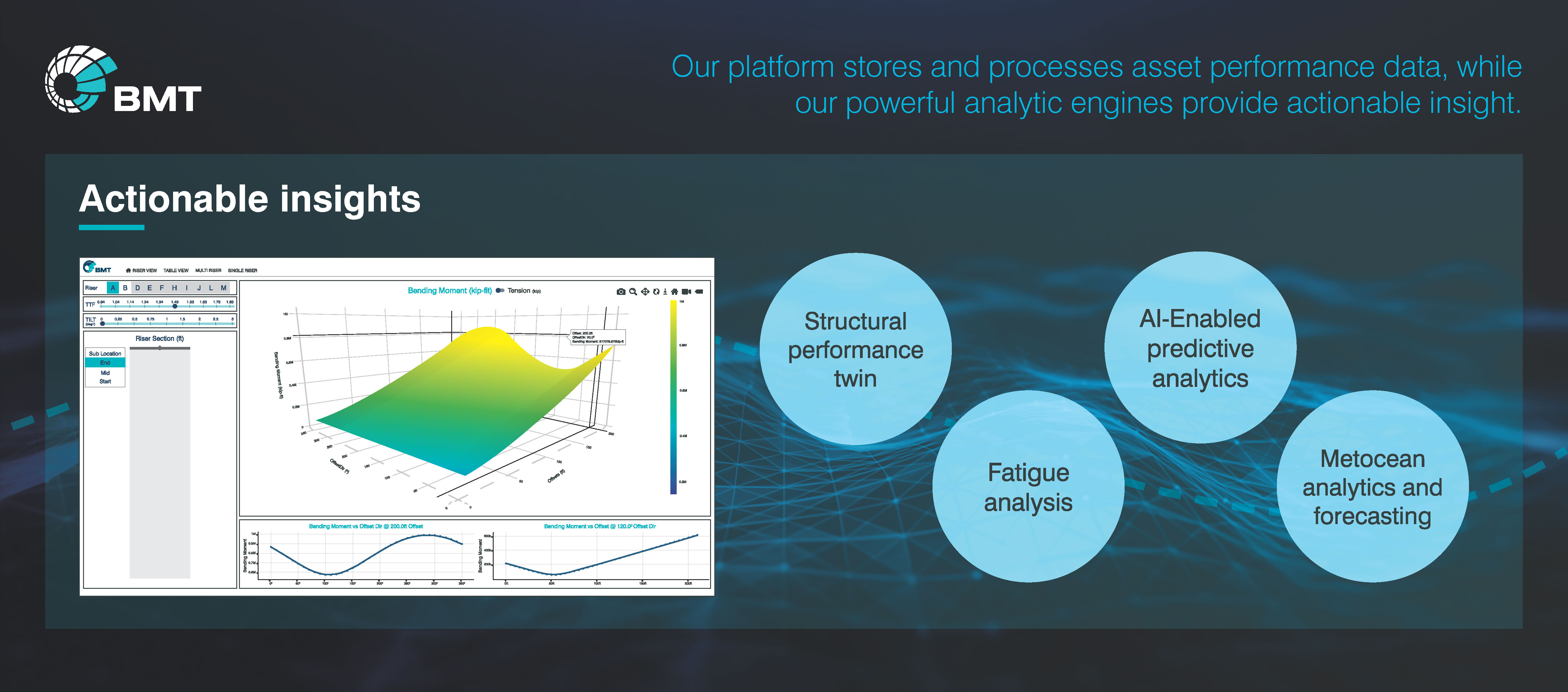 BMT DEEP, coupled with our integrated instrument packages, can be used to identify the risk associated with the asset operating beyond its design envelope or even extending out beyond it. By monitoring the impact of solid storm events on the vessel, fatigue calculations can be based on actual measured data, allowing fatigue to be calculated more accurately. Using BMT DEEP as part of the broader analysis initiative used to extend the life of the operations adds real value. It allows our customers to continue production beyond the scheduled end of the asset’s life. In addition, our integrated analysis approach allows significant cost savings in terms of reduced subsea inspections, maintenance, and increased confidence in extreme operating conditions when shut-in decisions are marginal.