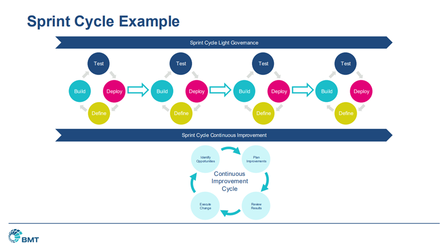 Rather than trying to write the perfect Programme Definition Document (PDD) in one go, break it into features or components. Develop each one through short cycles: draft, review, refine. This allows for early feedback, better alignment, and higher quality. It also creates momentum and a sense of shared ownership. Figure 1, shows an example of an iterative approach, which balances the sprint cycle with light governance and continuous improvement.